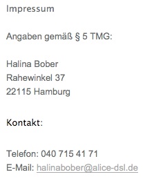 Der Nutzung von im Rahmen der Impressumspflicht veröffentlichten Kontaktdaten durch Dritte zur Übersendung von nicht ausdrücklich angeforderter Werbung und Informationsmaterialien wird hiermit ausdrücklich widersprochen. Die Betreiber der Seiten behalten sich ausdrücklich rechtliche Schritte im Falle der unverlangten Zusendung von Werbeinformationen, etwa durch Spam-Mails, vor.